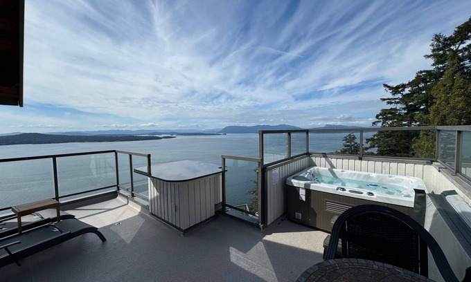 Enjoy a serene retreat at Sahhali on the Bluffs, Pender Island. This tranquil Cottage offers spectacular 180-degree views of the Salish Sea, facing south towards Vancouver Island, USA, Swartz Bay, and Salt Spring Island. Observe passing Orcas and Humpback whales, Bald eagles, Turkey vultures, and swallows in their natural habitat. Encounter local deer grazing nearby. Engage in hiking and cycling activities, followed by relaxation in your private hot tub while admiring the beautiful scenery in complete tranquillity. As an extension to the cottage, this configuration offers an additional 2 bedrooms with the same view in the main building on the same property, providing a total capacity to sleep 9 guests.
