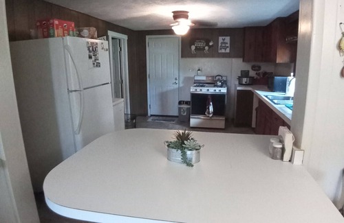 This craftsmen style home is located minutes from the White River in down town Cotter, Arkansas. Is 2 bedroom and 1 bathroom. Does sleep 5 people comfortably. With 3 twin beds and a king bed. Has a front porch with rockers. In the back yard you have a charcoal grill. Then you have a fire pit with chairs to lounge around.