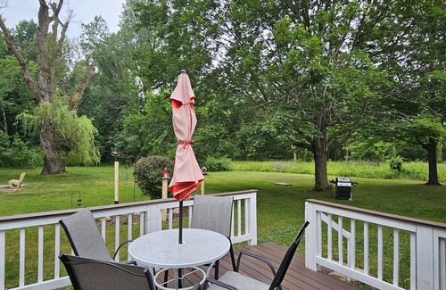 Large yard with deck and 80 foot willow tree. Enjoy the peace and tranquility or stay connected.