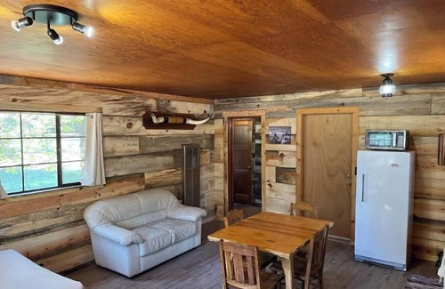 This charming cabin is 1 of 4 cabins scattered among 5 acres of tall pines where each cabin is situated in its own little locale with plenty of space in between each cabin. The cabin features 5 beds, (1 queen and 4 full) 2 kitchens, 2 bathrooms, a bedroom and 2 sitting areas with sofas for relaxing. The kitchens provide compact stove/ovens, fridges, and microwaves. Drip coffee makers and filters are also provided, just bring your favorite coffee! The kitchen provides minimal cookware, such as pots, mixing bowls, plates, cups and mugs, silverware, and cooking utensils.