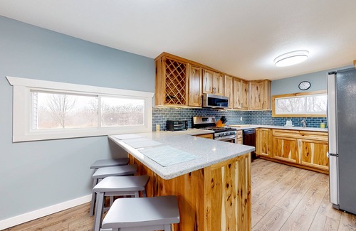Located on 43 sprawling acres and offering the perfect family-friendly getaway, feel right at home the moment you walk in the door! The comfortable living room features ample soft seating and a large TV. In the nearby kitchen, you will find gleaming countertops and stainless steel appliances. Dine family-style at the large dining table, positioned perfectly in front of the stone fireplace.