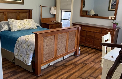 THIS COMFORTABLE QUEST ROOM WITH A QUEEN SIZE BED AND SEMI-PRIVATE BATH/ SHOWER HAS A SLIDING GLASS DOOR TO A WATER GARDEN, ACCESS TO THE POOL, SAUNA, AND HOT TUB. YOU HAVE LAUNDRY AND KITCHEN PRIVILEGES IN THE MAIN HOUSE AND A HUGH SCREENED PORCH WITH PLENTY OF PATIO FURNITURE.