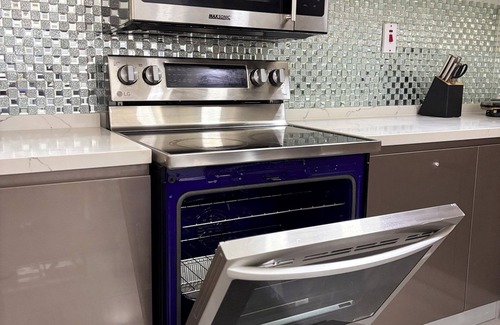 The kitchen is fully equipped with modern appliances, making it easy to prepare delicious meals. Whether you’re whipping up a quick breakfast or hosting a gourmet dinner, the space is designed to make cooking a pleasure. The dining area, with its elegant furnishings and views of the outdoors, creates the perfect setting for sharing meals and creating lasting memories.