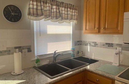 Living room is furnished with comfy sofa, loveseat, and round chair great for napping, ceiling fan, and large TV. The kitchen is fully equipped for cooking and dining in (full fridge, stove, microwave, dishwasher, toaster, blender, coffee maker, kitchen table and chairs, etc). The full bathroom has a bathtub/shower, vanity, toilet, built in storage, medicine cabinet, and towels.