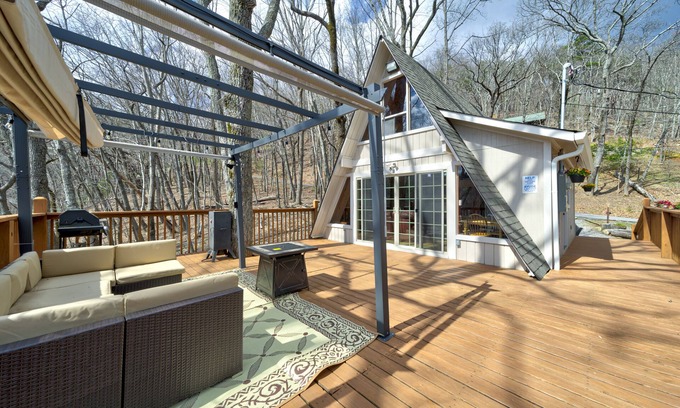 Beautiful inside and out, this mountainside A-frame retreat offers ultimate relaxation with its secluded setting. Wake up to the sounds of Mother Nature while brewing your morning coffee, or basking in the briskness of the woods while gathered around the firepit. The mountain views are incomparable, making it the ideal spot for hiking on the many trails or horseback riding. The tranquil sound of the creek babbling in the distance is the perfect background noise if you seek comfort and serenity. There are plenty of nearby amenities for the adventurer, including golf, pickleball, antiquing, and wine tasting.