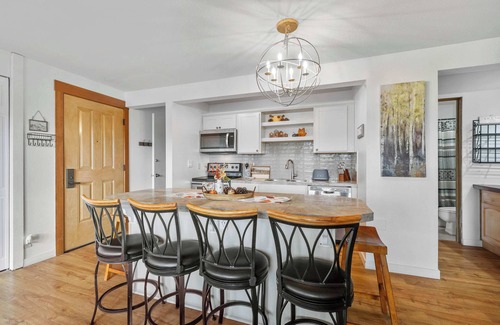Let relaxation take you over as you lounge in the cozy living room on the plush sofa or armchair seating, setting the electric fireplace ablaze in the colder months to create the perfect ambiance for streaming a new movie on the mounted smart TV. The modern kitchen is fully equipped with stainless steel appliances, drip coffee maker, cookware, and dining ware for the added convenience of preparing delicious meals right from home. The spacious island also serves as the dining area, where high-top stools can seat 6 for formal meals and quick bites alike.