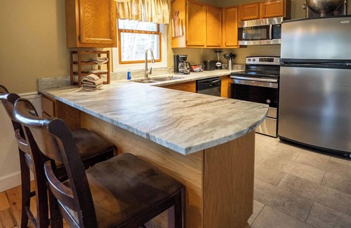 Couples delight in this Hocking Hills getaway – with great outdoor and indoor spaces on a wooded hillside. Screened porch for outdoor lounge seating and dining for four. From the hot tub and swing you'll enjoy a different view. And the firepit - yet another setting! Living room is open to dining, well-equipped kitchen and loft and features a gas fireplace and satelite tv. Wine enthusiasts appreciate the theme decor and additional accessories - such as ice buckets and glassware selection - to enhance their stays.