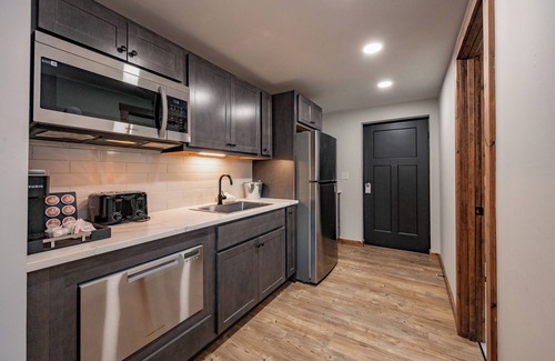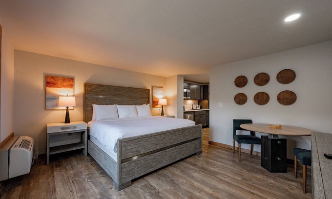 Comfort and convenience from every angle, this poolside suite retreat provides you access to everything in just a few short steps. Spread out in the plush King bed and rest up for your next lake adventure. Equipped with a full kitchen to cook meals, Smart TV, and a luxurious bathroom with walk-in shower and quality bath products. Walk right out to your private patio for two and take in the fresh mountain air before heading down to the pool or any of our amenities. This suite is accessed from the interior of the first floor for your convenience.