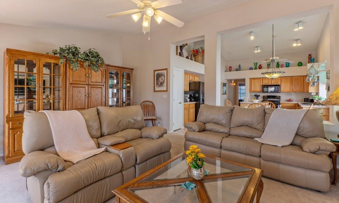 There is a separate dining and living room, and a great room with a large Smart TV, DVD player, two-seater recliner couch and leather sofa bed. This makes a fun retreat as the room spills out onto the covered patio with outdoor furniture, a barbecue grill and a lava rock gas fire pit. Wi-Fi and Dish cable are complimentary.