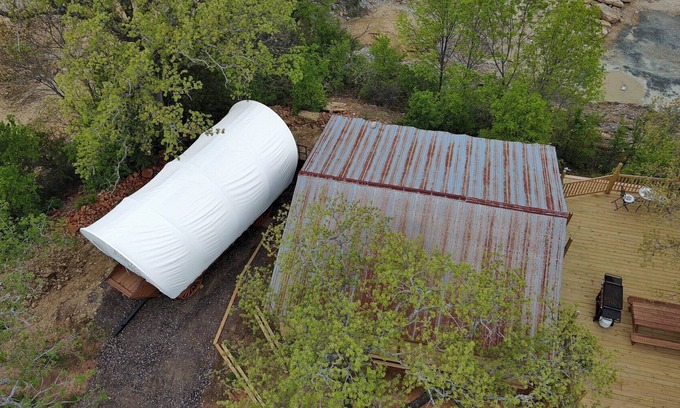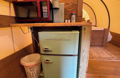 Covered Wagon camping has come to Mineral Wells, TX! Come allow your imagination to wander and experience what life must have been like in simpler times. Combined with modern luxuries, we are proud to offer a unique experience without sacrificing the comforts of home. Includes a luxurious king mattress, A/C and Heat, kitchenette w/ microwave, mini fridge, and a Keurig coffee maker. There is also a TV and Wifi to connect to your streaming services. The private bathroom with shower, toilet and sink located 15' from wagon.