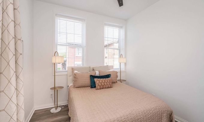 This home comfortably sleeps 2 guests within 1 private bedroom. The bedroom includes a queen size bed and spacious closet. The bathroom features beautiful black and gold accents and large walk-in shower.