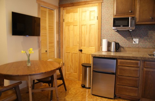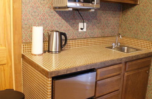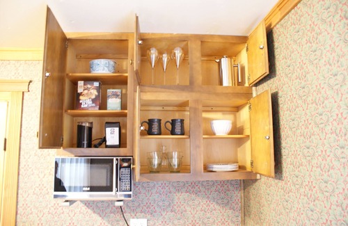 • Kitchenette: The kitchenette is equipped with a mini frig, microwave, coffee press, coffee grinder, drip coffee maker and tea kettle.