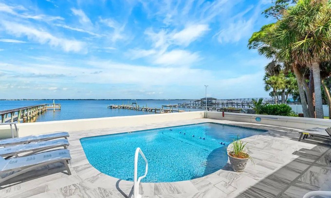 Forget your worries in this serene, newly renovated 2nd-floor unit on the Indian River. Enjoy a queen bed, full kitchen, and private balcony. Relax by the heated saltwater pool or cast a line from the fishing dock—poles and bait available upon request. Just 5 minutes to the beach and walking distance to restaurants and the Eau Gallie Arts District. Your peaceful riverside escape awaits!.