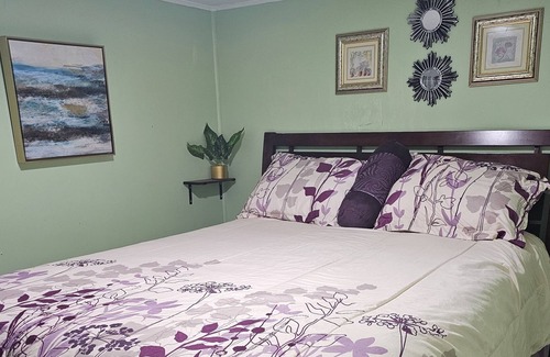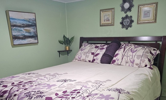 Cozy 1 bedroom cabin, designated work space. Bedroom has a queen bed. Living room has 2 futons.Full size bathroom with tub/shower combo. Kitchen has a full size refrigerator, hot plate,toaster oven, microwave, coffee pot, just about everything you need. Electric grill on the front porch. Country atmosphere but conveniently located.