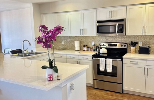 Enjoy a relaxing stay in this oceanfront 1-bedroom condo located on the top floor of a peaceful, safe building. Just a 15-minute walk to the beach and steps away from cafes, restaurants, shops, and department stores. The unit includes a queen bed, plus a foldable queen and twin bed for extra guests. One dedicated garage parking spot included. Perfect for couples or small groups seeking a beachside escape.