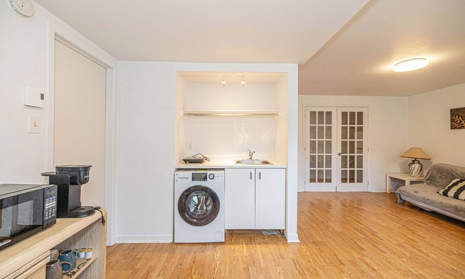 This cozy home locates at the east of Montreal, 3 big gardens around this duplex.This apartment has 1 bedroom,1 kitchen and 1 bathroom, it's half basement but has sunshine during morning. No air conditioner but very cool during summer.