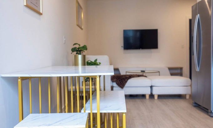 Our charming one-bedroom unit offers a cozy and stylish retreat, perfect for both short and extended stays. The bedroom is furnished with a comfortable queen-size bed and features a green rocking chair positioned by the window, creating a peaceful spot to unwind. A 50” Roku TV is available for your entertainment, with complimentary access to Netflix and Peacock, or you can log into your personal accounts to enjoy additional streaming options. The spacious walk-in closet connects the bedroom and bathroom, providing extra convenience, and is equipped with a bench, mannequin for outfit styling, luggage rack, and a clothes steamer along with an ironing board and iron.