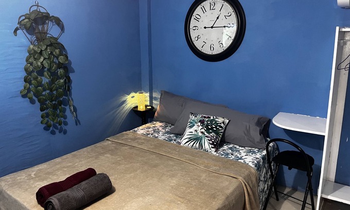 Bedroom : One bedroom for a max of 2 guests. Bedroom is Blue Themed has a Queen sized bed with AC and a 32” Smart TV