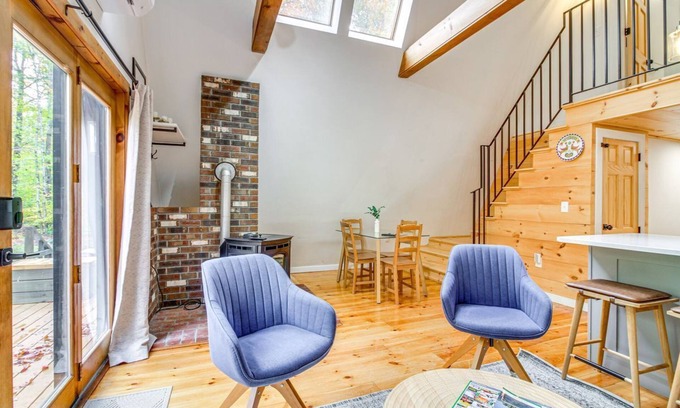 Discover a picturesque Vermont retreat at this 2-bedroom, 1.5-bath A-frame cabin in Weathersfield! Take in the peaceful, wooded setting while grilling up a meal and enjoy quiet, starlit evenings gathered around the fire pit. Adventure awaits — ski Okemo Mountain, cast a line in the Black River, or hike Mt. Ascutney trails. Later, curl up by the pellet stove and stream your favorite movie!