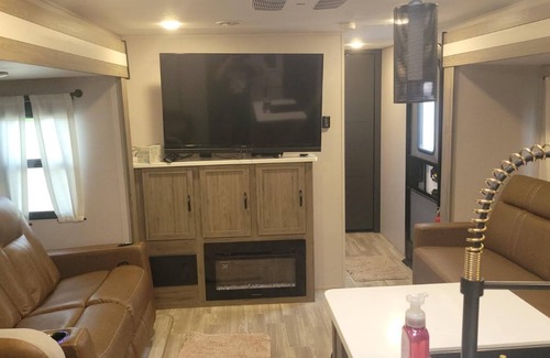 This phenomenal property features 2 cozy bedrooms with a mix of queen, twin, and full beds, perfect for a group of friends or family. With amenities like heating, AC, fireplace and WiFi, guests can stay comfortable and connected. The bathroom offers a convenient shower for refreshing after a day of exploring. There is an outside screened in room with large TV, table, chairs, fans. Book now and enjoy everything this marvelous recreational vehicle has to offer.