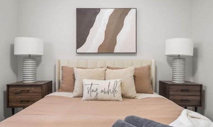 Features two stylish queen bedrooms, a fully equipped kitchen with stainless steel appliances, a living room with a smart TV,, washer & dryer.