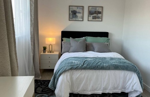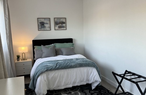 The bedrooms are thoughtfully furnished, with bed linens, extra pillows, and blankets ensuring a restful night's sleep. Catch up on your favorite shows on the TV, or stay connected with the provided WiFi and dedicated workspace. Air conditioning and heating ensure your comfort in any season. Iron, ironing board, and clothing storage are also provided for convenience.