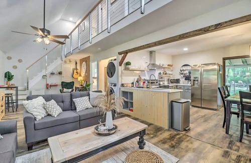 INDOOR LIVING: Smart TV, wood-burning stove, board games, contemporary decor, open floor plan, ceiling fans