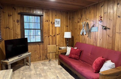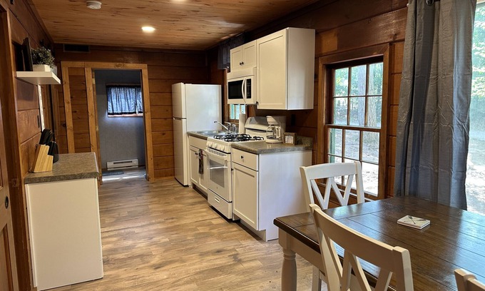 Cozy 3-bedroom cabin with living room, full bathroom, full kitchen with refrigerator, stove, microwave, toaster, coffee maker, pots, pans utensils, plates, glasses and silverware.