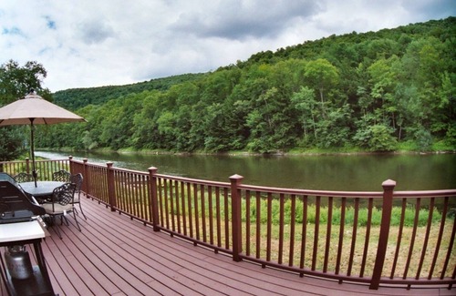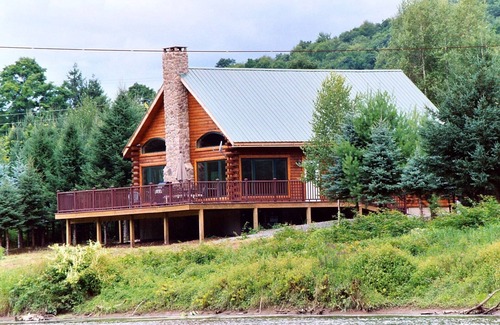 Nestled on the Banks of the Upper West Branch of the Delaware, between the town of Deposit & Hancock NY, this delightful cabin offers 3 cozy bedrooms offers the utmost in privacy and seclusion for your getaway, sporting private fishing access (fly fishing only, catch & Release) and having an "away from everyone" atmosphere. These three bedroom two bath cabins are the finest accommodations in the area and are perfect for larger groups. With over 1800 sq. feet of living space these cabins feature a full stainless steel kitchen, Italian Leather furniture, river stone fireplace, and an amazing 40 foot deck overlooking the river. These cabins hold a maximum of six people. The sleeping arrangements consist of a king size bed in the upstairs bedroom, a futon in the upstairs loft, the two downstairs bedrooms have two single beds in each bedroom. Whether you're looking for a tranquil retreat or a cool adventure, this cabin is the perfect spot for an enjoyable getaway. We look forward to welcoming you to our place.
