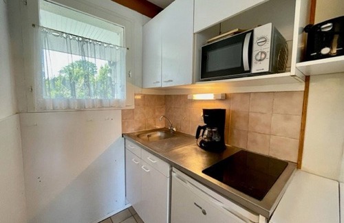 - Equipped kitchen (electric hob, mini oven, fridge),
