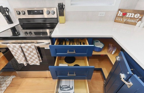 The interior of the home has been recently updated with modern finishes and stylish decor. The living and dining area is perfect for relaxing or entertaining guests. Dine out at the top restaurants located in our downtown, within a short walk, or prepare your own meals in the fully equipped kitchen featuring all new appliances. Essentials include dishes, cookware, a blender, a toaster, and basic coffee service.