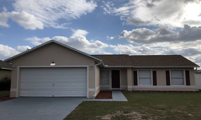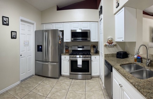 This is a beautiful 4 bedroom home with a South-facing pool and game Room. Newly renovated Gas appliances, Propane Gas Grill, Propane Gas Firepit. Master room has a King size bed and bathroom. Bedroom #2 Queen, bedroom #3 Day bed that turns in to a Queen, bedroom #4 is a Queen bed. Sleeper sofa. Plenty of parking at the property. Close to Walmart and Publix. Home near Disney and Universal. Quiet, friendly, and safe neighborhood. Large screened-in pool and fenced in backyard. This house has security cámaras outside the 3 main entrance of the house they are monitored 24/7.