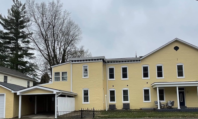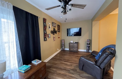Discover this enchanting 4-bedroom gem in Madison(entire home newly renovated). Nestled in a peaceful neighborhood, this amazing house offers a truly enchanting retreat for guests. With 1 king bed, 2 queen beds, and 1 full futon(w mattress topper), there's plenty of space for everyone to unwind and relax. Immerse yourself in the cozy ambiance and make use of the provided amenities like the movie room w a variety of DVD's, 55" smart TV, children's books/games, fast reliable WiFi, large dining table perfect for meals, playing cards/games, comfy living room also with smart TV, streaming your personal favorites, (5 total smart TV's-every bedroom, movie room/living room), 6 input iphone/android charging station, reading/enjoying our quiet library, use of W/D, hair dryers in every bathroom, portable fans on every nightstand, iron/ironing board, and AC/heat. The 3 bathrooms are equipped with everything you need, including hair dryers, shampoo/conditioner/body wash, shower/bathtub, "forgot something baskets"(razors/toothbrush/ear plugs/toothpaste & more). Fully equipped kitchen, standard & Keurig coffee makers with a variety of coffees/tea. Enjoy your time in Madison at our charming house, Mulberry Manor.