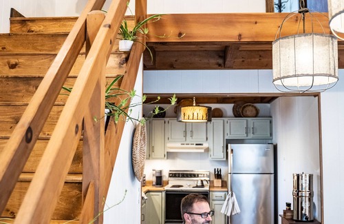 The lower-level living area features leather couches, an HDTV that sits above an electric fireplace for added ambiance, and a handmade vintage bar space where you can mix up any cocktail of your choosing. Bar is equipped with wine glasses, pint glasses, cocktail glasses, koozies, and a large freezer to store your ice.
