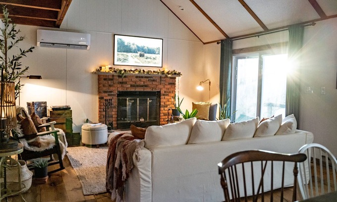 Living area with soaring cathedral ceilings, comfortable couch and rocking chairs, woodburning fireplace, Samsung Frame TV, record player, bluetooth speakers, and games to help pass the time.