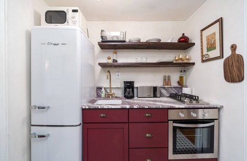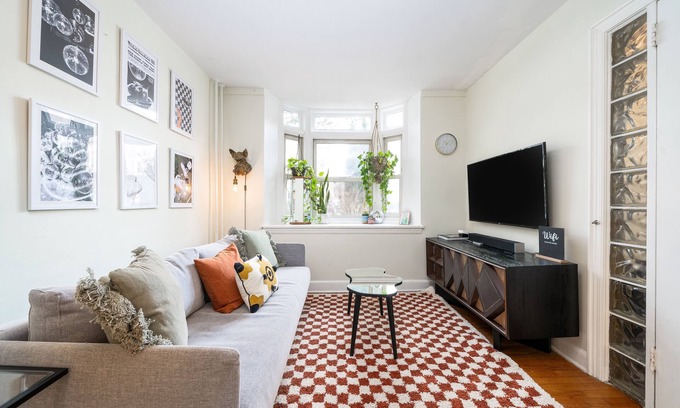 Kick back and relax in this calm, stylish space. This recently renovated apartment, situated on the first floor of our charming two-family home was designed with your comfort in mind. There is one bedroom that comfortably sleeps two, along with a pull-out sofa in the living room accommodating an additional two guests. .Unwind in the spacious backyard, right off the bedroom.
