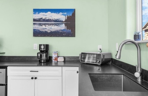 The apartment features a kitchenette with full sink, single burner stovetop, and ninja toaster oven/air fryer combo. A raised bar top can be used for dining, or as a desk to keep up with work while on the road. External monitor and keyboard are available for working while on the road.