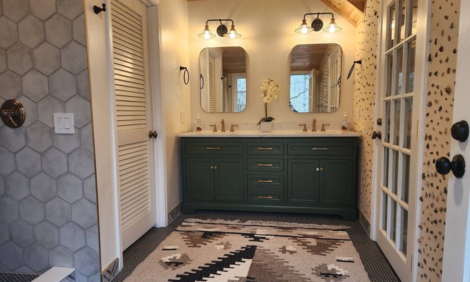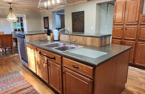Ruby Gem Cabin offers 4 bedrooms with 5 beds, a queen blow up and room on the large living room sofa to accommodate up to 11 people. The kitchen and dining room are large with plenty of chairs. 2 newly remodeled bathrooms with special design touches, plus an additional outdoor shower for the warmer months.