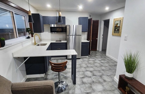 Enjoy a perfect escape in our annexed private guesthouse, ideal for three guests. This cozy single-room apartment has private access, ensuring your stay is both comfortable and secluded. Dive into relaxation with access to our pool/Jacuzzi, or enjoy an evening BBQ on the patio. The space includes a private bathroom, full kitchen and laundry room. Located close to the Mesquite center. Perfect for friends seeking a memorable retreat!