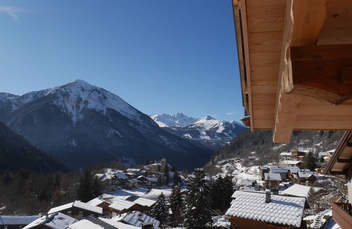 Cozy ambiance decoration with old wood and stone. Warm, bright, mountain view balcony on the Vanoise and Courchevel.