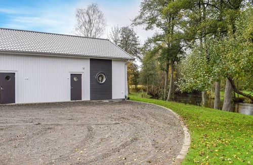 This beautiful vacation home is located directly on Skålån in Åby. It is built in 2019 and has a very good standard. There is a fantastic wooden terrace by the river where you can sunbathe and watch the rapids.
