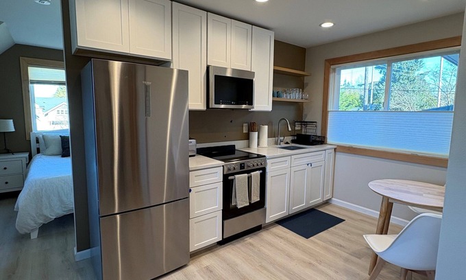 Discover the beauty of Bellingham from this 1-bedroom apartment. The cozy space features 1 queen bed in the bedroom and a sofa bed in the living room. This convenient location is a short walk away from the shops and restaurants in Fairhaven, the beach at Marine Park, the trails of Chuckanut Mountain, and all that Bellingham has to offer. Fall in love with Bellingham and enjoy the magic it has to offer. This cozy apartment is brand new construction with all new appliance and furnishings. It has beautiful touches and big windows with lots of light in a quiet and quaint neighborhood.