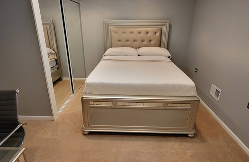 This basement has its own private electronic keyless entry. It features 2 bedrooms, 1 full bath. Master bedroom has a walk-in closet and a king size bed with a work desk. The second bedroom has a queen size bed with a work desk. It also has an in-unit Washer & Dryer and is equipped with a Microwave, Coffee Maker and a small Fridge.