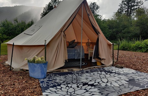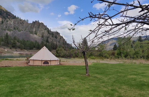 Peace of Paradise is what you'll find in 1 of our 5 quaint and cozy Glamping tents along the river, overlooking the spectacular river views! It's surreal beauty from every angle, tranquil peace and calm! A short walk takes you to the rivers edge where Bass and Pike are a delight to every fisherman! Your experience includes, but is not limited to, an open fire pit for cooking, table and chairs for eating, drinking water, dishwater, river and mountain views from your site, lamps, phone charger port, shared shower house and clean porta potties. Kayaking, paddle boarding, swimming and relaxing are a few of the charming delights just out your front door. Can't pull yourself away from the glacier blue river views, the charming old fruit trees in the lawn and the cozy campfire at night! Experiencing the western trains rumbling down the valley is a highlight to many campers. (There are no Railroad crossings or air horns near our property.) Just a short 2 miles down the road, a mineral soak awaits you at Quinn's Hot Springs Resort. You can also enjoy a cute, best in the west ice cream shop ten minutes away in the town of Wild Horse Plains, a darling old town which also hosts antique shops, grocery, hardware, hospital and so much more! The old and fascinating town of Thompson Falls and a local Bison range, are less than an hrs drive away!