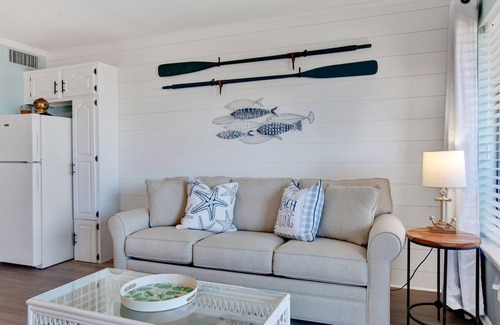 Find your beach lifestyle at our Sun N Fun condominium located in the Savannah Beach and Racquet Club on Tybee Island, Georgia. This intimate retreat is perfect for a couple or a small group looking for relaxation and exploration. Step inside this one-bedroom condo, and your view down the hall includes an ocean horizon. This entryway includes plenty of storage space and a convenient closet. The condo has a clean, light color palette with ocean accents throughout. To your right, you'll find the bedroom and bathroom nestled away from the main living space.
