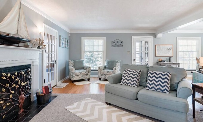 Snuggle up on plush seating in front of the gas fireplace after a day of strolling along the shoreline of Lake Erie. With homey decor, a color palette of light gray, and whimsical nautical flourishes, this home radiates warmth. Sleeping quarters with queen beds and a full bathroom are located on the second story of the home.