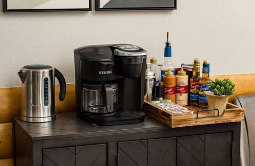 Venture up the stairs from the entertainment area, or use the homes second primary entrance to gain access to the main floor. If you choose to enter from outside you will take the stairs next to the garage that lead you up to the wrap around deck. If you're not quite ready to head inside you can stop here to enjoy the six Adirondack chairs and propane fire pit. When you enter the front door you will be greeted by the large vaulted ceilings and warmth of the gas powered wood stove at the press of a button...no need to haul firewood after a long day just to enjoy the warmth of a fire! The formal living room has plenty of room for your entire group to spread out and recover after a long day of outdoor activities. Off of the living room you will be welcomed to the kitchen by its open vaulted ceilings with beautiful exposed beams. We love to cook and take pride in offering all of the essentials you'll need during your stay including spices, chefs knives, serving wear for 40 (who wants to do dishes every day on vacation?!), cookware, blender, mixer, and of coarse a stocked coffee bar. There is enough seating for 10 in the attached dining room, as well as two additional barstool seats at the kitchen island. Go back through the living room and down the hallway to find bedrooms two and three featuring a queen bed in one and a bunk bed in the other. It's in this hallway that you will find the second full bathroom complete with walk in tiled shower.