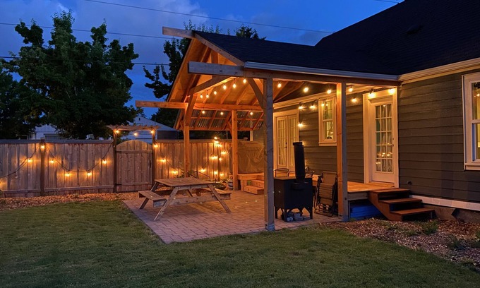 Outside: The yard is about a third of an acre, with a large covered patio and a section of soft green lawn to play or relax in. Most of the rest of the yard is taken up with garden or animals. When we rent the house out, we schedule someone to come feed the animals, so you don't have to worry about that. Currently we have chickens and two pigs.