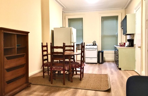 Cozy apt in a brownstone building with bedroom, den, spacious living room with open kitchen and eating area, beautiful bathroom with old world's charm. Lots of light, high ceiling. 2nd Floor apt, only one flight up from the main entrance. Parking with fee right across the street on first come first served basis.