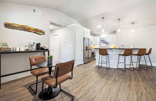 Inside, enjoy luxury amenities for up to eight people! When you enter, you'll find our open concept living room. This space features a large cozy sectional, chairs, a huge bean bag chair, a Smart TV, and board games! The kitchen is fully stocked and has a coffee nook with coffee supplies and seating next to the electric fireplace. Near the backdoor is our dining table for 6!